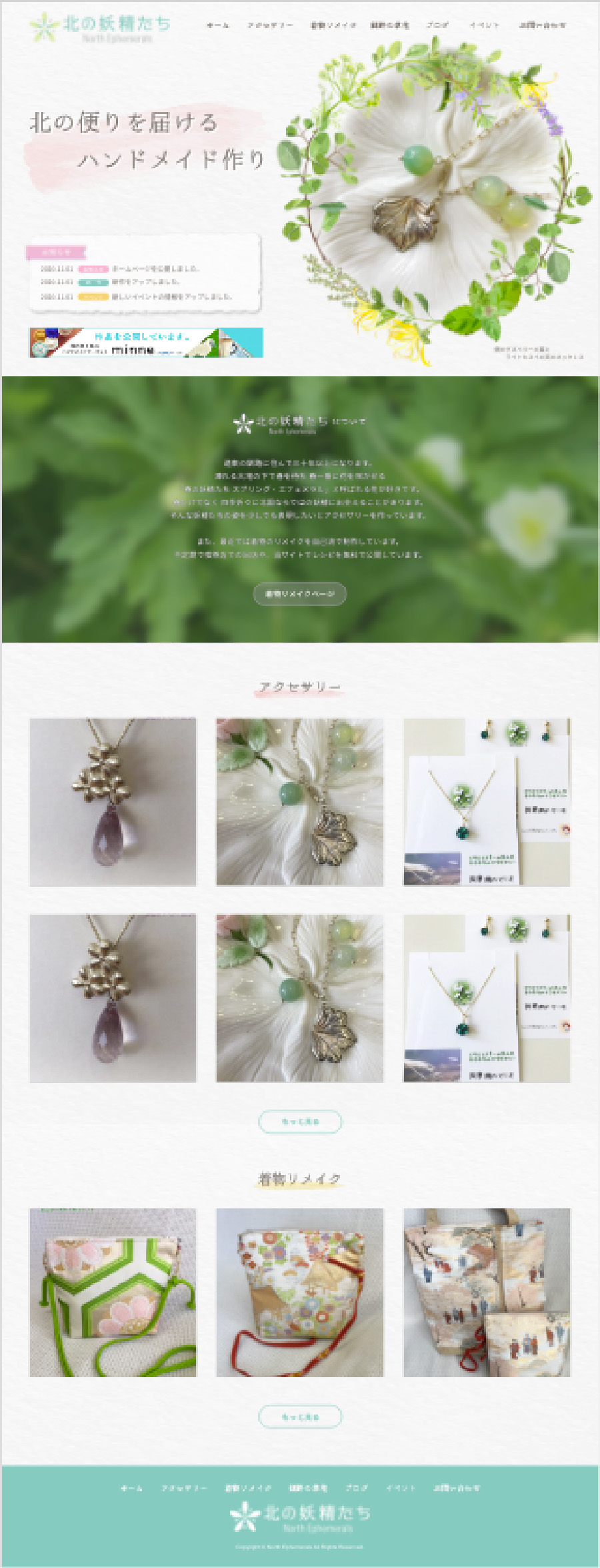 WEBデザインはロゴをいかして、北海道の自然と母の作る優しいアクセサリーをイメージして柔らかい印象も持てるようにしました。 サイトの構築はWordPressでオリジナルのテーマを制作して完成させました。